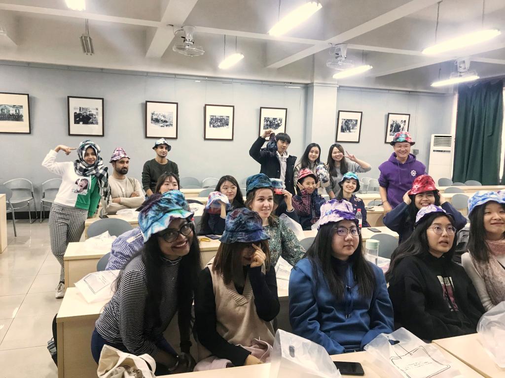 “传统扎染技法”课程由我校毕业生单思琪进行授课,她向留学生展示了大理地区的传统扎染手法,深入浅出地讲解了扎染这种工艺的含义和渊源,使同学们对扎染有了一个基本的认识。随后引导大家尽情发挥创造力,使用基本的扎染手法进行个人作品创作。