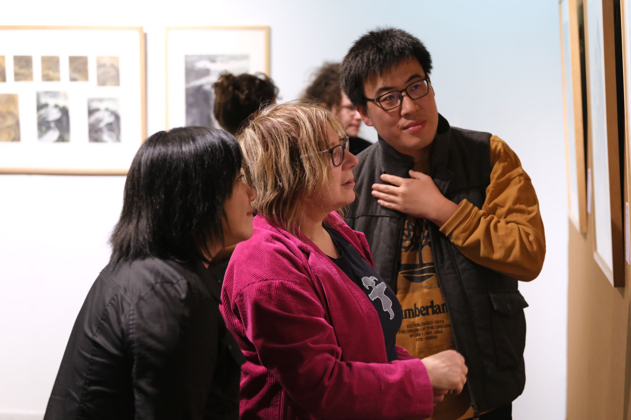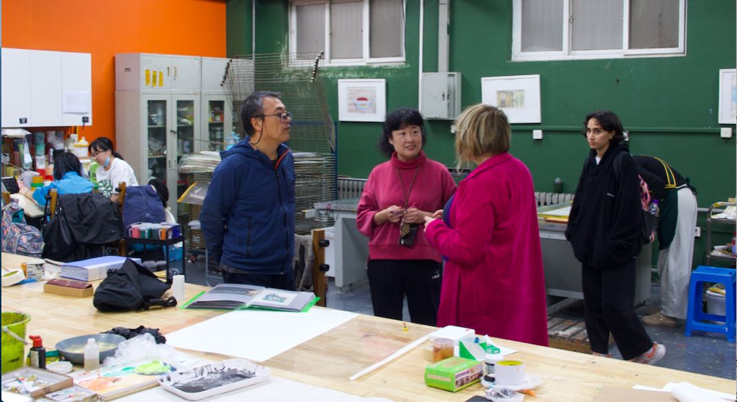 德方院校师生参观了校园,对我校整体教学环境进行了初步了解。首先走进米兰·体育官方网站美术馆,正值《吕云所教学文献捐赠展》展出。来访团队中大部分学生都是第一次访问中国,初次接触中国水墨画领域,对中国文化艺术的了解便从这里开始。艺术的感受是相通的,跨越了国别与文化差异,作品富有冲击力的表现方式以及笔墨运用时蕴含的饱满的情绪感染着大家,作品的色彩及构图激发了同学们浓厚的讨论。之后德方师生来到版画工作室,参观丝网、石版等工作室,现场感受教学环境和学习氛围。最后,探访了中国画实验室,由赵栗晖教授为同学们讲解赏析敦煌绘画艺术、敦煌壁画的工艺原理,同学们不时分享着对线条运用和色彩搭配的理解。第一天美院浓厚的学术氛围和丰富的艺术活动给师生们留下了深刻而美好的印象。